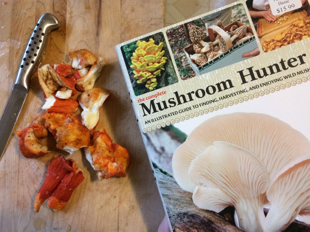 Like Lincoff and other sources will tell you, lobster mushrooms (Hypomeces lactifluorum) are really either Russulas or Lactarius mushrooms that have been attacked by a parasitic ascomycete mold.